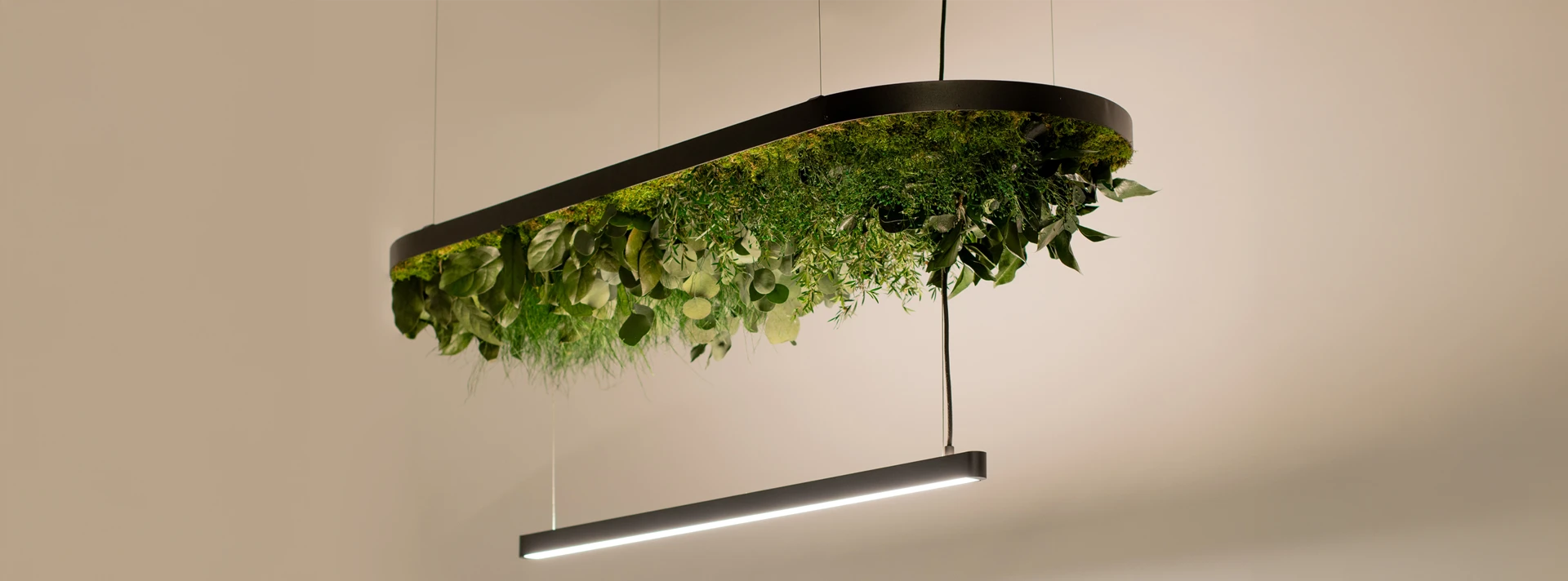 Hoverlight is a suspended luminaire that fuses natural design with technical excellence. Designed to bring both acoustic comfort and a soft, ambient light, it integrates a lush panel of preserved plants into a sleek and sustainable lighting fixture.