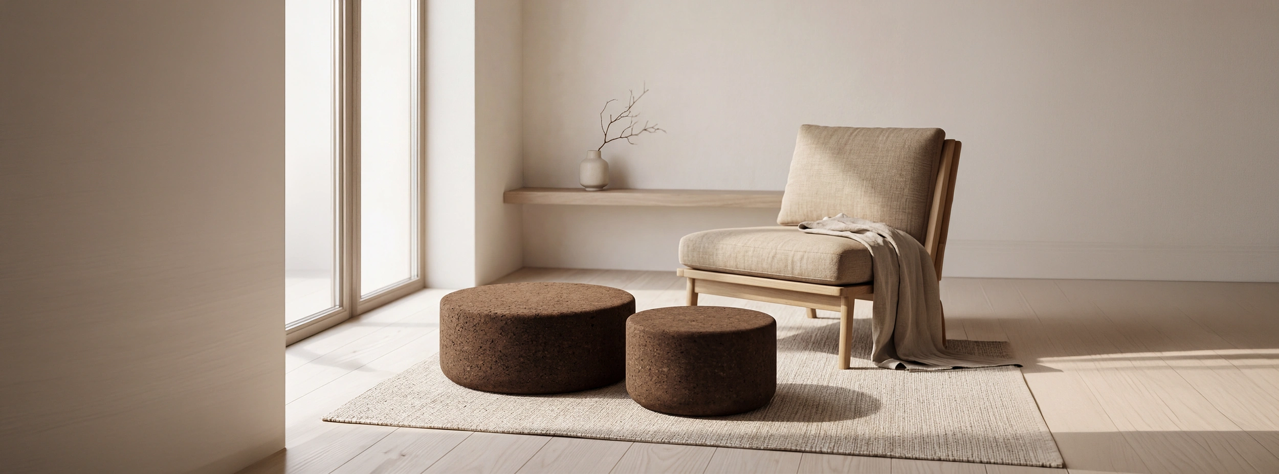 Made from expanded cork, our poufs combine comfort, durability and a raw, tactile texture. Each piece is lightweight, hypoallergenic and naturally fire-resistant, perfect for everyday use in any space.